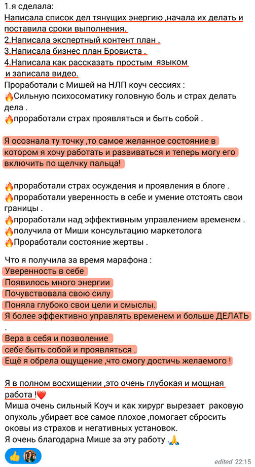 Нина ушла с сессии с новой установкой “Мой мир — мои правила”, где она работает для себя и СВОЕГО удовольствия. И главное, детально и по полочкам знает, что и как делать.